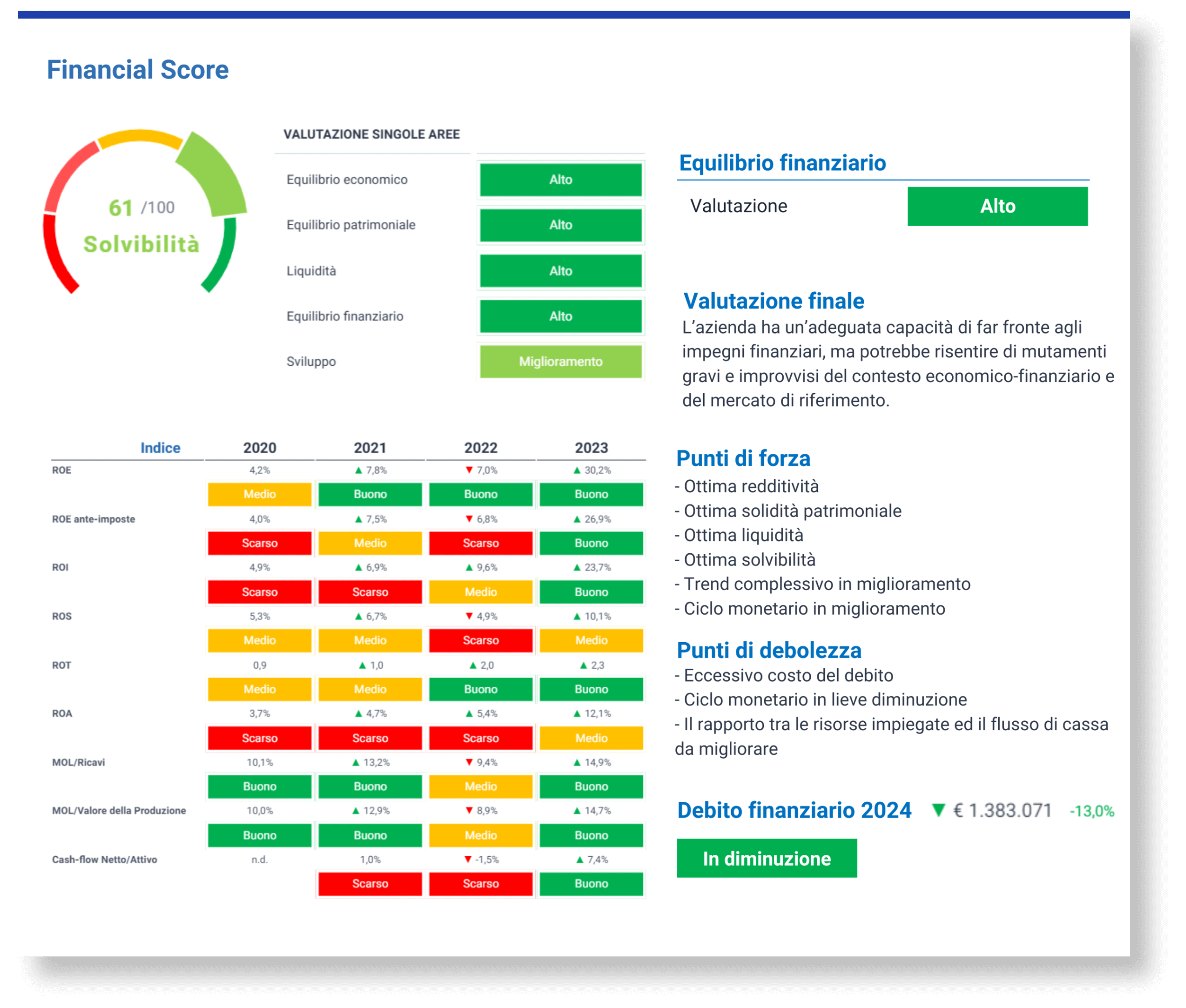 Score proprietario sviluppato per valutare in modo sintetico e oggettivo la salute economico-finanziaria di un’impresa. (Funzione disponibile nei software: Analisi di bilancio e rating e Gestione della crisi e strumenti di allerta).